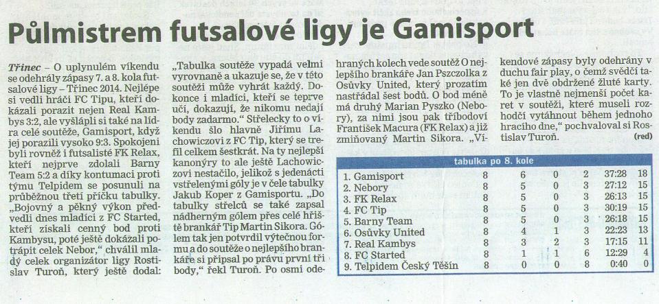 Díky Lukáši Turoňovi z mužstva FK RELAX se naše futsalová liga dostala i do regionálních novin.